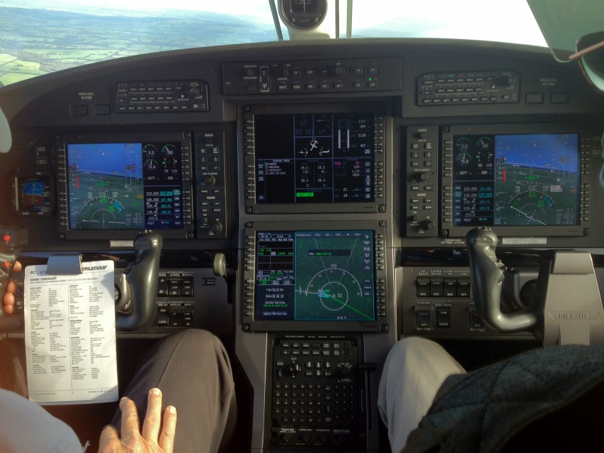VH-FMM Cockpit Published August 14, 2012 at 3264 × 2448 in Learning to fly a PC-12 The cockpit of my training aircraft The main flight systems run on a Honeywell Apex system using 4 screens. The aircraft backup flight instrument, to the extreme left, is also electronic; there are no ‘steam’ gauges in this aircraft at all.