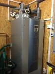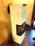 - An efficient and zero-air-exchange wood stove. This draws external air through the combustion chamber and exits the air via a flue, without exchanging that air with the air inside the house. Above the heating chamber is a box full of stones which act as thermal mass to allow the unit to keep heating the room even once the wood has burned out. The properly has about a decade of wood stored there, salvaged from prior clearing of the site. Because the house is so efficient at holding in its heat, this is extremely effective to heat the primary living space in the house.