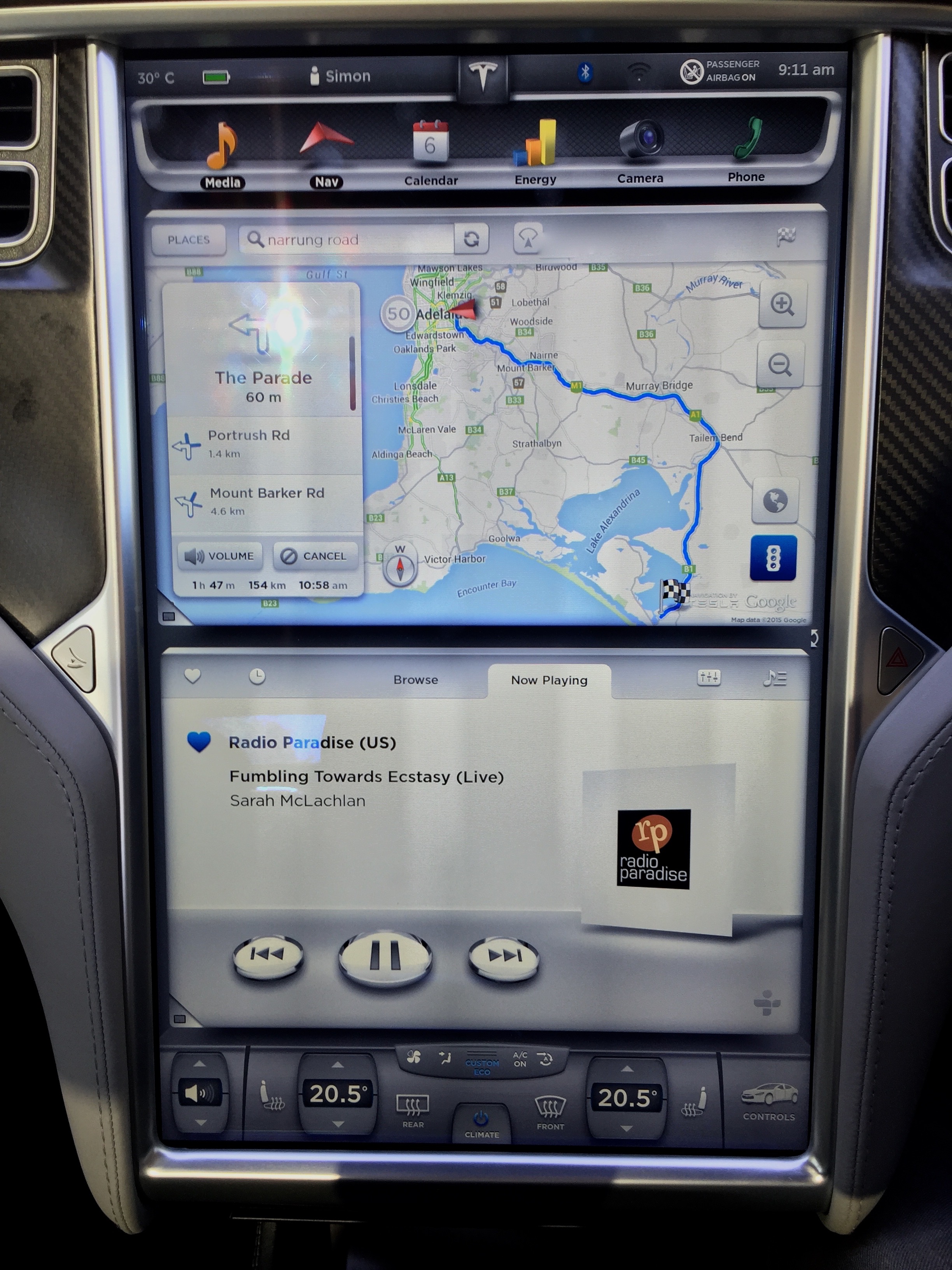 Model S uses Google Maps for navigation (of course), including real-time traffic congestion data. The latest Model S software release adds calculations using global terrain elevation data to decide what percentage of your currently available electrical energy is needed to reach your destination – and return – without stress.