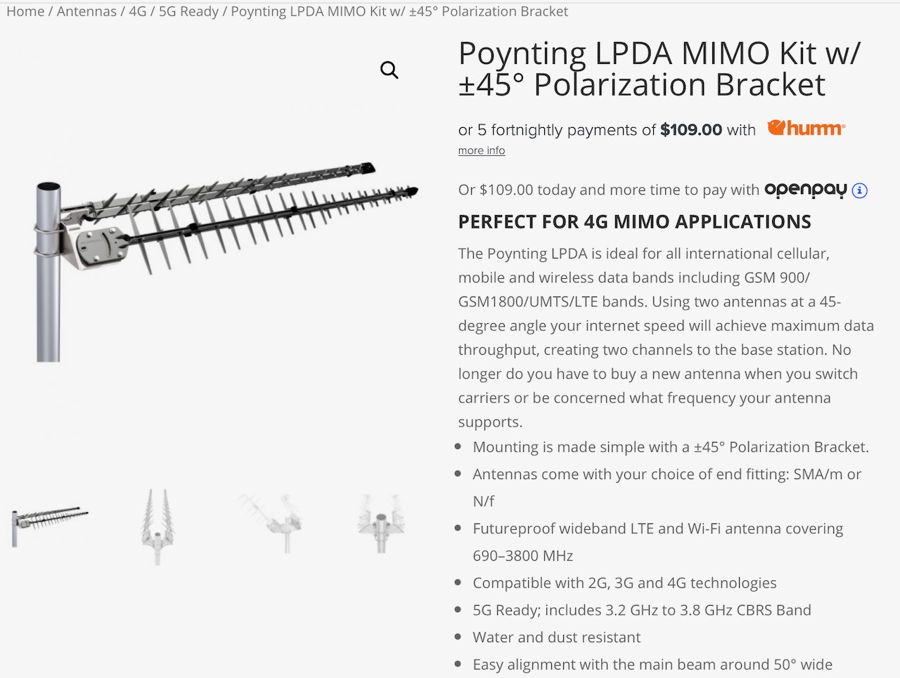The antenna kit that did the trick for me is a properly aligned (2 x 45 degree offset) pair of serious Yagi antennas, a suitable mount to achieve that alignment, a backhaul cable, and a 2 x TS9 adaptor tail set to suit the NetGear LB 2120’s on-board TS-9 sockets.