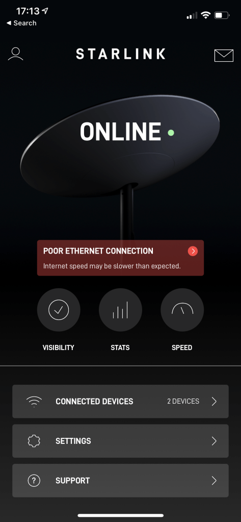 What I saw on the Starlink app was a fault indication… ‘Poor Ethernet Connection’