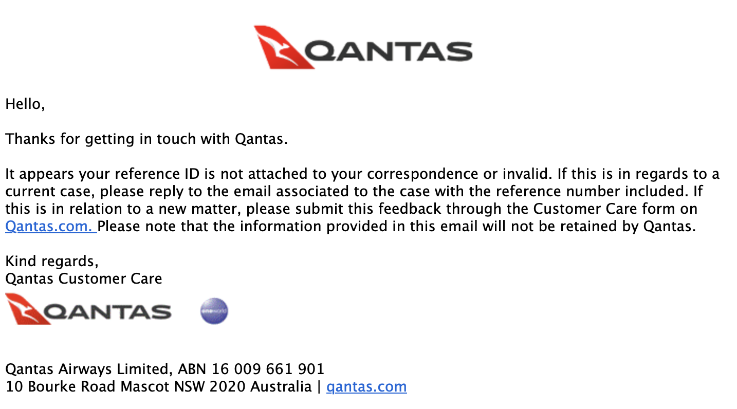 How the hell is the wrong number in an email back from Qantas? Are the replies hand written or cut/paste driven rather than coming out of their actual support system? How much effort does it take to break your own internal ticketing system like that?
