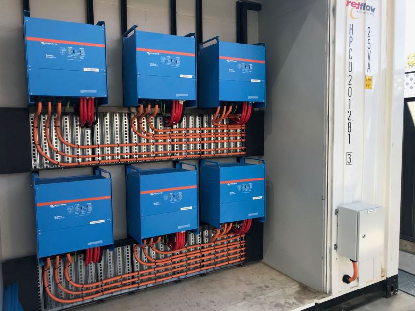 Victron Energy Inverter/Chargers come in sizes up to 15kVA / 12kW per unit (which is what these units are). They can be combined to support three-phase systems (as here) with a total of up to 18 units able to be clustered. On this site, 72kW total (over 3 phases) was a great fit to the peak energy demands that we have.