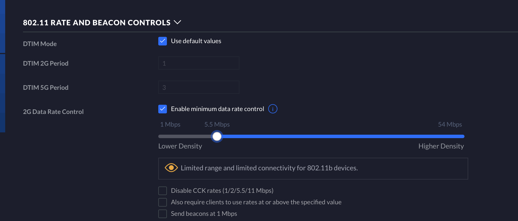 Note that on the UDM (vs the UDM-Pro), there are different checkboxes to restore 802.11b connectivity. On that platform, you (again) turn off the optimiser and then under your WiFi network configuration page you’ll find a switch hiding in the “Advanced” section “Enable Legacy Support”. This switch is explained with the text ‘Enable legacy device support (i.e. 11b)’. Duh. So turn that on (i.e. do enable the legacy device support).