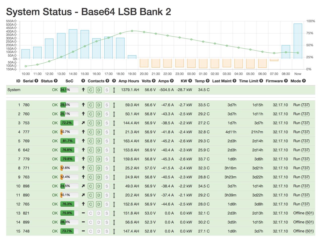 A test run of the system during commissioning. Three batteries were offline during this test – in normal operation they are all online. You can see from the chart at the top how the system charged on surplus solar during the day and then supported the site throughout the evening, before returning to charge the next day. Zero grid usage in this particular 24 hour period.