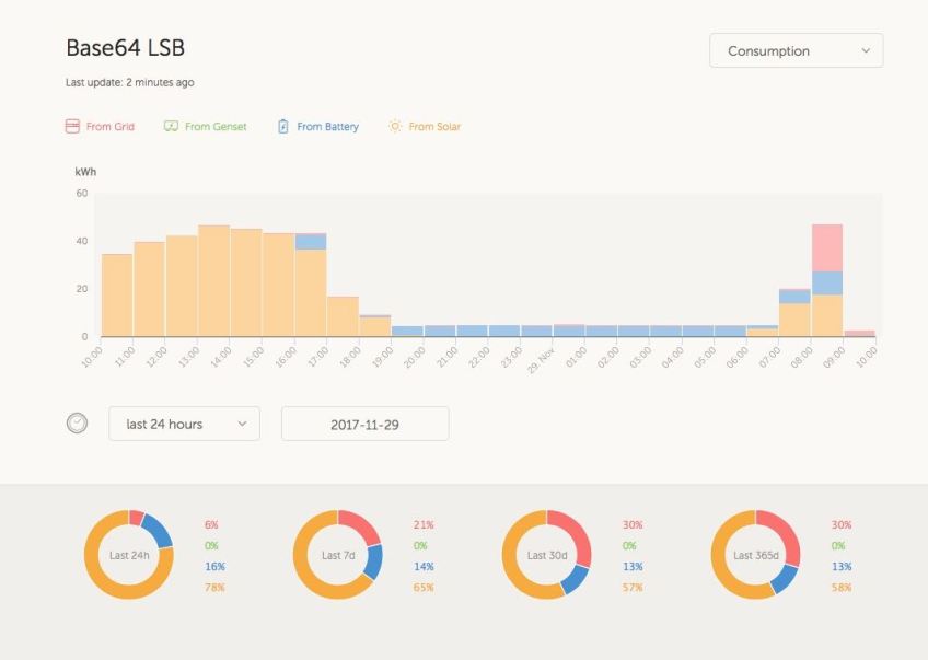 During this 24 hour period, the office was mostly direct-solar powered, with surplus going into the battery system. At night that surplus kept the building and its systems running, and contributed to the energy demands on the following morning before there was enough solar energy to support the load.